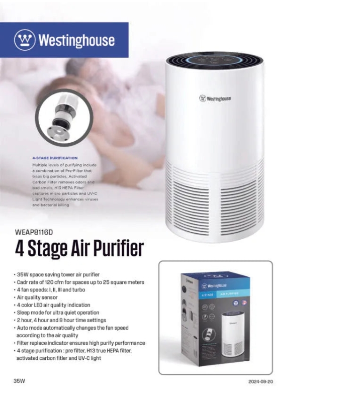Westinghouse WEAP8116D یک دستگاه تصفیه هوا مدرن و کارآمد برای خانهها و آپارتمانها است که با سیستم ۴ مرحلهای — شامل پیش فیلتر، فیلتر HEPA H13، کربن اکتیو و UV-C — همانند سپری قدرتمند مقابل ذرات ناشی از آلرژنها، گرد و غبار، موی حیوانات خانگی، دود، گازها و میکروارگانیسمها (باکتری و ویروس) عمل میکند. این ترکیب فیلترها تضمین میکند هوای محیط خانهتان سالمتر، پاکتر و ایمنتر برای تنفس باشد.