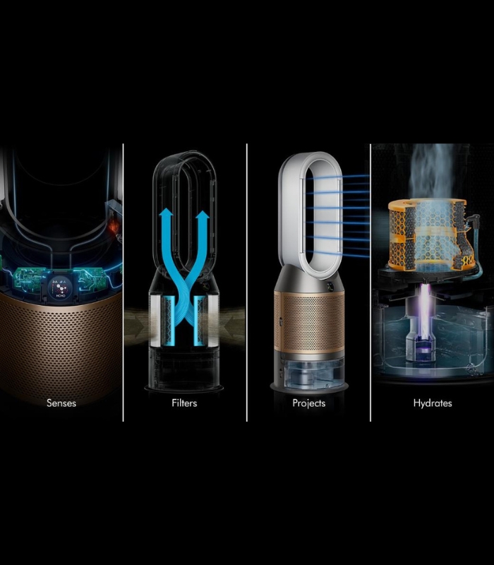 دستگاه Purifier Humidify+Cool De-NOx PH05 یک مدل پیشرفته از دستگاه تصفیه و مرطوبسازی هوای Dyson، ترکیبی هوشمندانه از سه عملکرد را در یک دستگاه جمع کرده است: تصفیه هوا، مرطوبسازی بهداشتی و خنکسازی محیط. سیستم فیلتراسیون سهمرحلهای HEPA H13 همراه با فیلتر K-Carbon، ذرات تا 0.3 میکرون را با کارایی 99.97 ٪ میگیرد و همچنین گازها، بوها و حتی فرمالدهید را حذف یا تجزیه میکند.